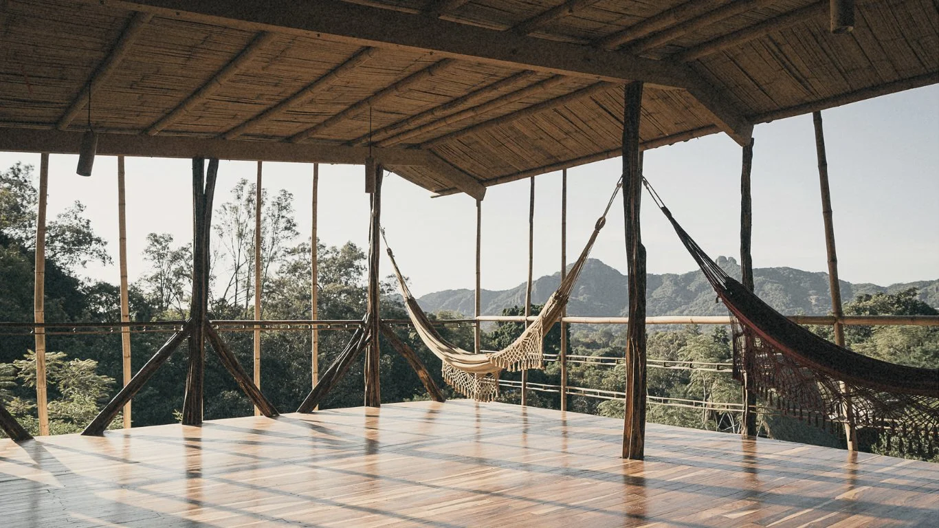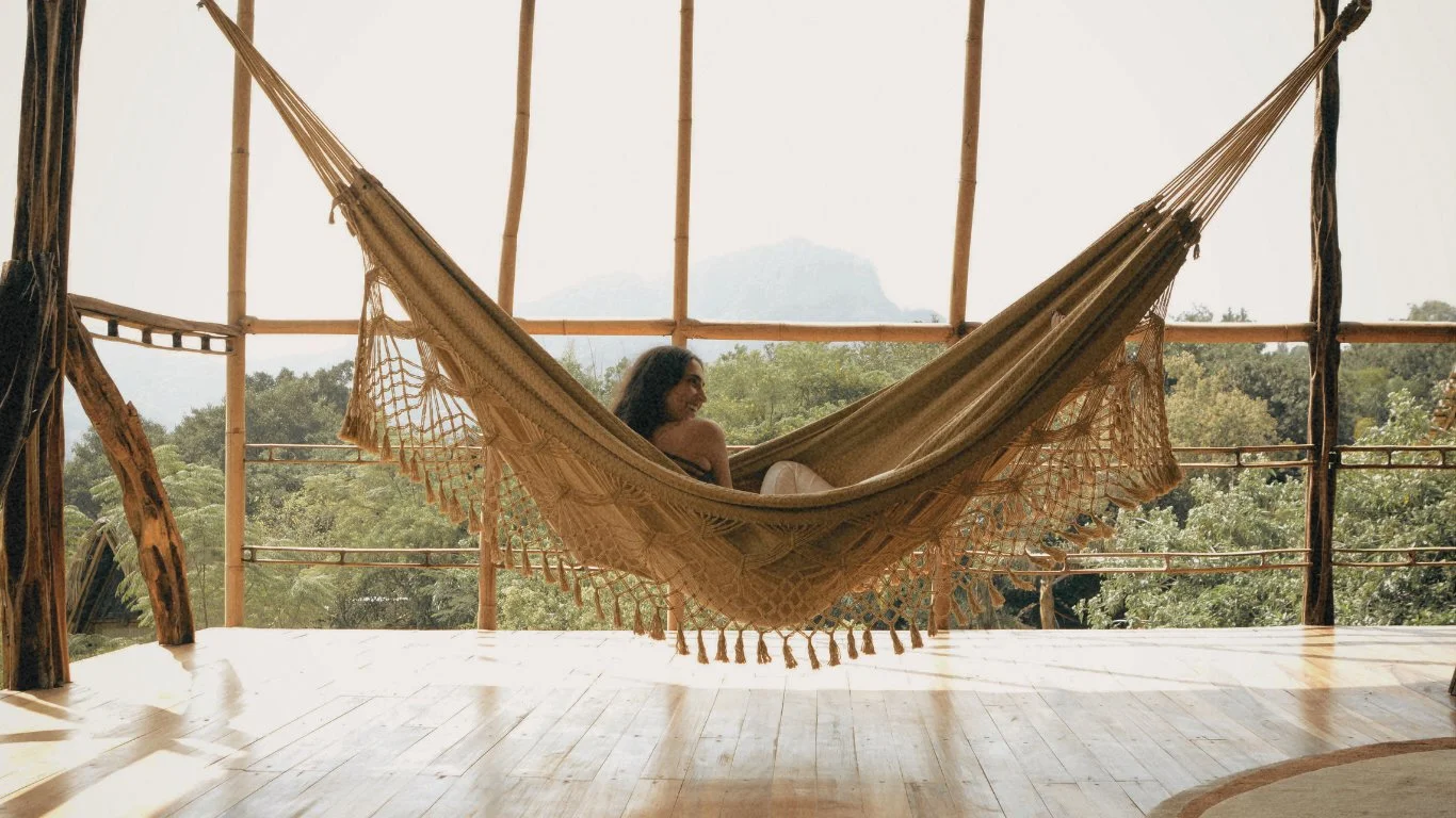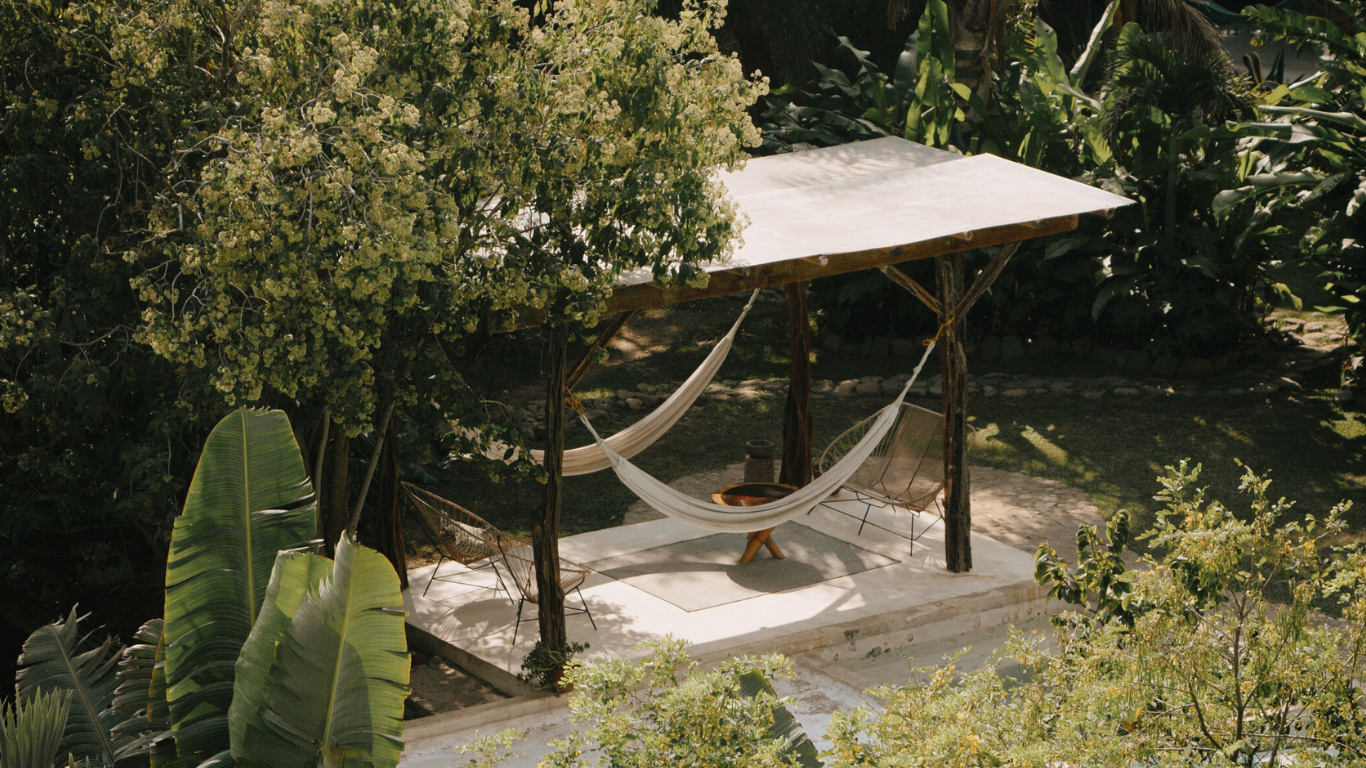 West facing with a magnificent Sunset view. Contains hammocks and carpets with the purpose of creating a magical and authentic space for relaxation and privacy.